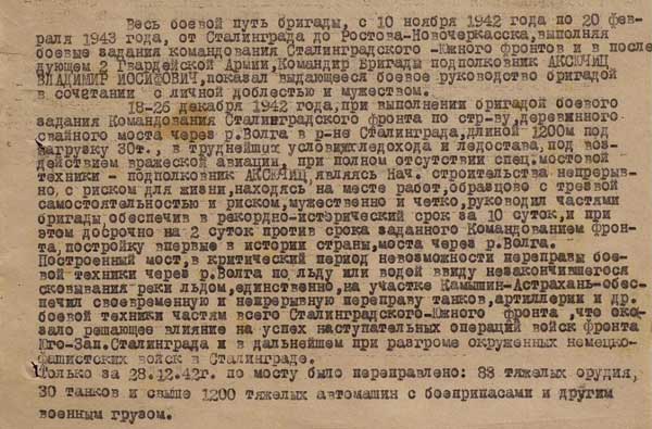 Стройка свайного моста началась 18 декабря 1942 года и велась в обстановке леденящей воды и налетов вражеской авиации. В гуще строительства находился командир бригады, проявивший исключительные организаторские способности, знания, опыт и личное мужество.