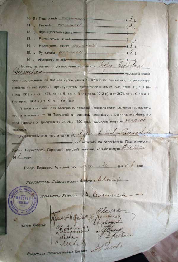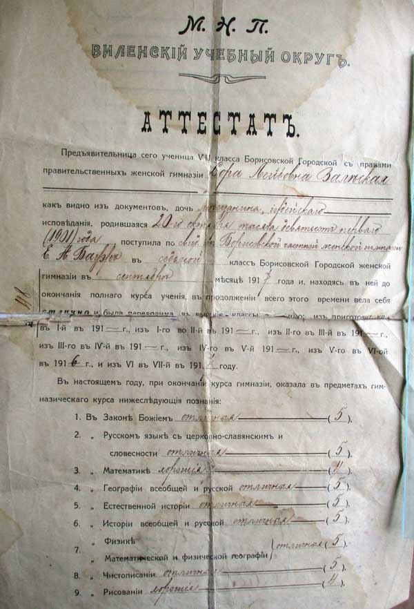 Взгляните на аттестат об окончании Борисовской частной, с правами правительственной, гимназии, который был выдан 20 июля 1918 года выпускнице 1902 года рождения, дочери мещанина иудейского вероисповедания Соре Лейбовне Залеской (так в документе, почему-то с одним "с").