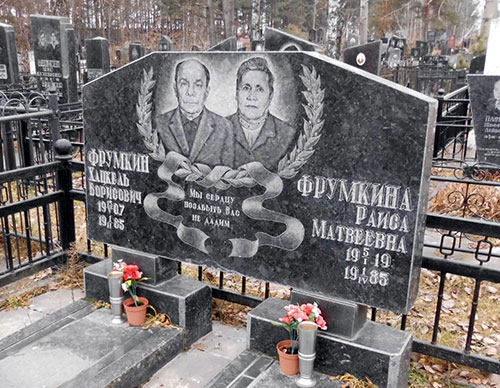 Вот этот добротный памятник можно увидеть на еврейском кладбище в Борисове по ул. Светлова. На нем фотография супружеской пары Фрумкиных, которые проживали в доме № 56-а по ул. Лопатина, и умерших почти одновременно – в 1985 году.