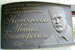 Остается добавить, что Иван Хрисанфович Колодеев был не только библиофилом и коллекционером, но и активнейшим членом Общества ревнителей старины, инициатором установки нескольких памятников. Он точно рассчитал те места в Студенке, где генерал Эбле построил свои знаменитые мосты, и в 1901 году установил на этих местах, в 80 саженях друг от друга, мемориальные знаки (проект художника и друга И. Х. Колодеева корнета Н. В. Зарецкого).