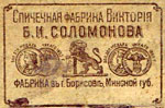 Уместно вспомнить, что в Борисове имелась и еще одна спичечная фабрика - «Виктория», располагавшаяся на территории нынешнего завода агрегатов (там можно и нынче найти ее следы). Эту фабрику основал еще за 10 лет ранее «Березины» широко известный в то время спичечный король Бер Соломонов. Эта фабрика имеет тоже богатую, хотя и весьма короткую историю. Вскоре после прихода к власти большевиков ее деятельность была прекращена. О памятнике почившей в бозе спичфабрике не подумали (кстати, в мире имеется несколько памятников спичке), но память о ее основателе сохранялась еще в течение многих лет. Вдоль высоченной, доминирующей над округой, фабричной трубы огромными белыми буквами красовалась несмываемая надпись: СОЛОМОНОВЪ. 1912 г. Однако никому не мешавшее это имя богатого фабриканта лишало спокойного сна коммунистов. Уничтожать могилы видных деятелей царского времени (например, Колодеева и его отца-генерала) можно было без больших затрат, а с верхолазными работами одной лопатой не справиться. Тем не менее, где-то в 60-х годах прошлого столетия средства нашлись, и надпись была закрашена.