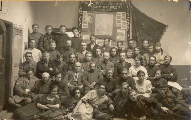 Партийная ячейка фабрики, 1924 год. Во втором ряду снизу четвертый слева - красный директор Ш.Н. Зайденберг. Фото из фондов Борисовского краеведческого музея