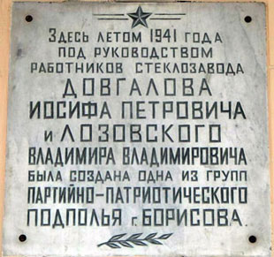 Кстати, надписи не всегда продуманы. Например, мемориальная доска на железнодорожном вокзале представляется совершенно безликой. Она сообщает о том, что на ст. Борисов в годы фашистской оккупации действовала группа патриотов-подпольщиков. Но ведь эти смельчаки имели имена. Неужели нельзя было назвать хотя бы руководителя? Здесь выгодно отличается мемориальная доска на здании заводоуправления стеклозавода. На ней имена подпольщиков указать не забыли.