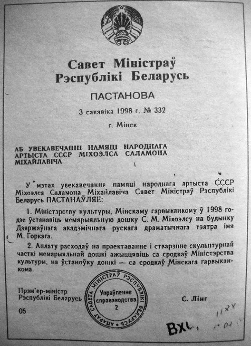 Выше дословно изложено постановление Совета Министров Республики Беларусь от 3 марта 1998 года об увековечении памяти Народного артиста СССР С. М. Михоэлса путем установки в том же году в Минске мемориальной доски на здании Государственного академического русского драматического театра им. Максима Горького мемориальной доски.