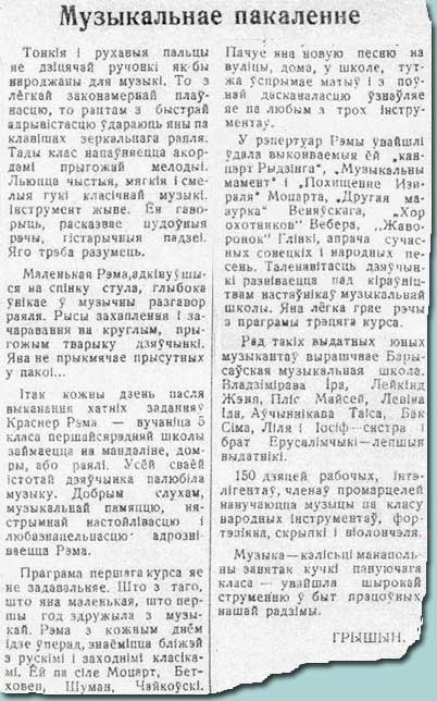 Были еще классы виолончели и народных инструментов. Учиться играть на подобных инструментах было проще, чем, скажем, на фортепиано, которое дома было лишь у считанных учащихся (рояль в Борисове был только у врача Клионского).