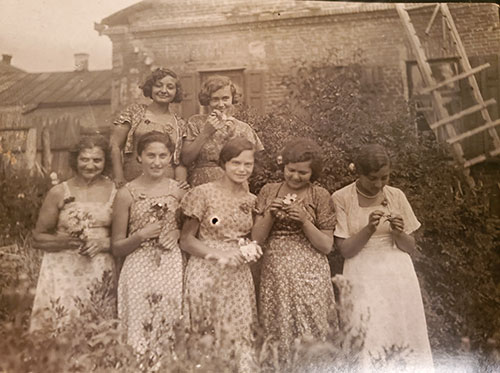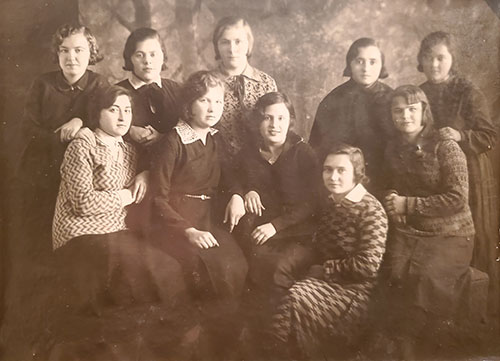 Верхний ряд, стоят слева направо: Циля Хайкина, Гершенович, неизвестная, Рахиль Бененсон, Ида Шейнеман.