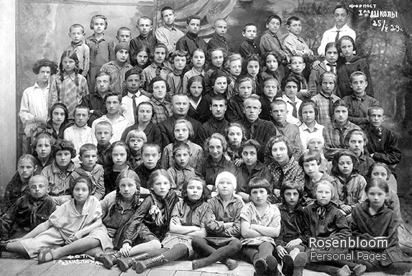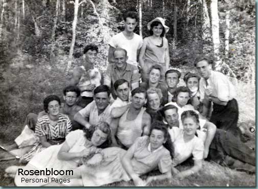 Группа еврейской молодежи на отдыхе. Слева направо, 1-й ряд: Роза Подрабинник и Райя Клебанова; 2-й ряд: Эся, Лева Залкинд, Алик Фунт, Миша Шлезберг, Феликс Герштейн, Мира Мазо, Митя Колбасников, Муся Фридман и Аня Либенсон; 3-й ряд: Михаил Миркин, Моисей Фридман, ?, Зуня, Эмма Гольдберг и Шая Гольдберг; 4-й ряд: Давид и Лена; Борисов, август, 1948. Прислал Леонид Миркин