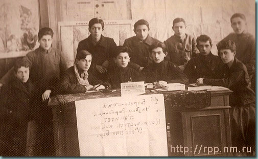 Уездный комитете комсомола. В первом ряду третий справа - секретарь комитета Меер Кузениц. 1922 год, Борисов