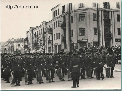 Борисов, 1960 год. 3-я слева - бывшая учительница русского языка (1-я СШ) Серафима Левина, рядом с нею её сын Боря Фридман, будущий контр-адмирал, кандидат технических наук, заслуженный работник геодезии и картографии Российской Федерации, а возле него - военный дирижер Игорь Архангельский.