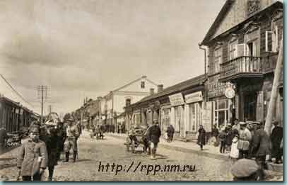 4. Бывшая улица Полынская (ныне часть ул. Дзержинского между ул. 3-го Интернационала и ул. Лопатина). Двухэтажный деревянный дом справа был уничтожен еще в 1920 году. Видны вывески провизора, шапочника и галантерейщика. Слева выделяется столб с проводами. Это еще не электричество, но электрификацией города немцы уже занялись.
