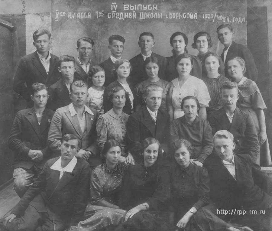 2-й ряд: ?, Витольд Гаврилович Бутвиловский, преподаватель физкультуры, Белозерова, преподаватель немецкого языка, Алексей Трофимович Климкович, преподаватель физики, директор школы, Зыся Абрамовна Аранчук, преподаватель математики, ?