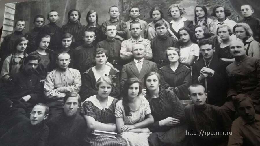В центре - директор школы Макар Павлович Сальманович.Слева от него учителя Любовь Бройдо, Василий Самцевич, Яков Лёсик.Первый ряд, третья слева - Галина Реут.