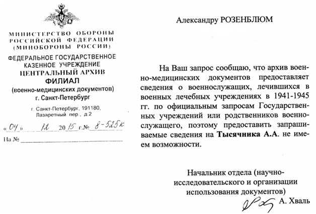 Поскольку ведущий специалист сочла, что запрос архивных справок для Управления Вооруженных Сил Беларуси по увековечению памяти защитников Отечества и жертв войн обременителен, мне был указан адрес военно-медицинского архива в Санкт-Петербурге, куда я и обратился с соответствующим письмом. В ответе сказано, что запрошенная справка может быть выдана только по запросу государственного учреждения или родственников.
