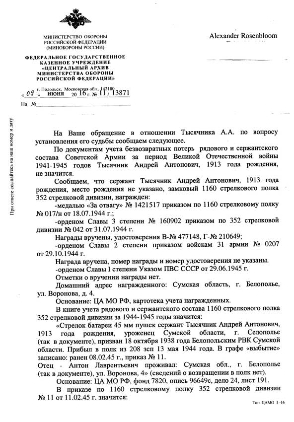 Не стану утомлять читателя рассказом о том, сколько времени и усилий потребовалось, чтобы узнать архивную правду о полном кавалере ордена Славы Тысячнике Андрее Антоновиче. Эта правда изложена в прилагаемой официальной справке Центрального архива Министерства обороны Российской Федерации, которую я получил 10 октября 2016 года.