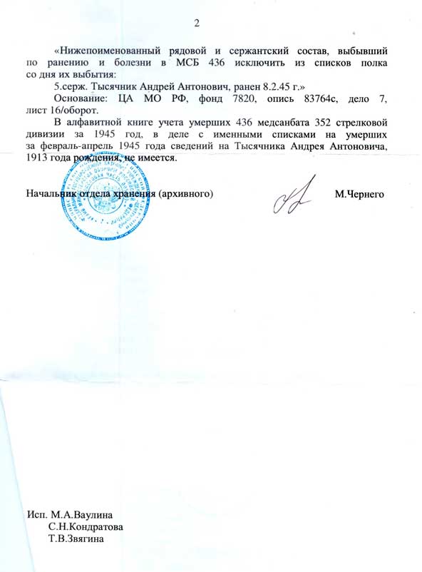 9 ноября 2015 года последовал дословный ответ: «В автоматизированном банке данных «Воинские захоронения Республики Беларусь» и обобщенном банке данных «Мемориал» Тысячник Андрей Антонович не значится».